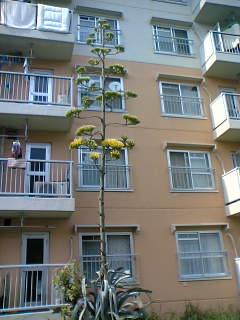団地の4階まで伸びています。黄色の花を下からつけ始めました。最後は倒れてしまうのだろうか。